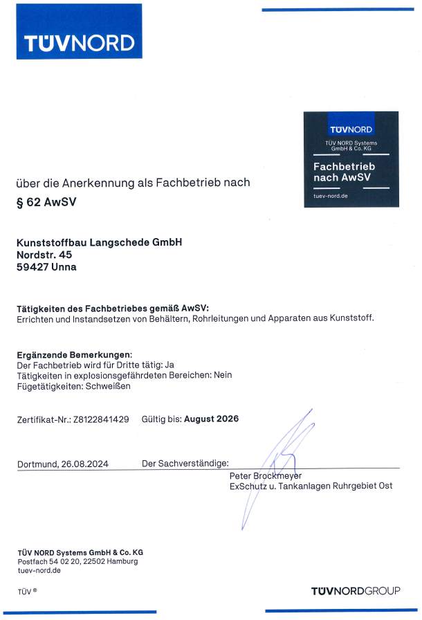 Am 26. August 2024 erfolgte bei Kunststoffbau Langschede GmbH die regelmäßige Überwachungsprüfung nach § 62 AwSV durch TÜVNORD.