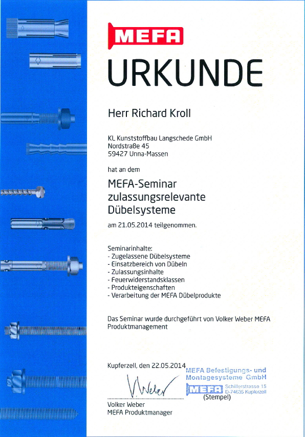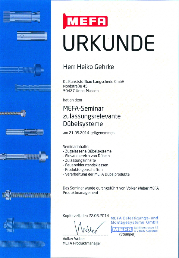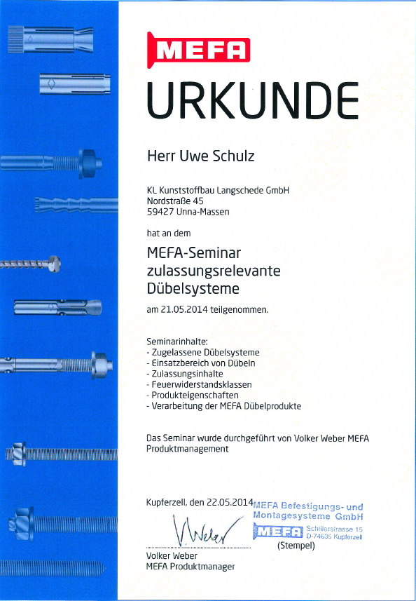 Am 21.05.2104 wurde ein Fachseminar zum Thema "zulassungsrelevante Dübelsysteme" mit anschließendem Praxistest in unserem Hause durchgeführt.