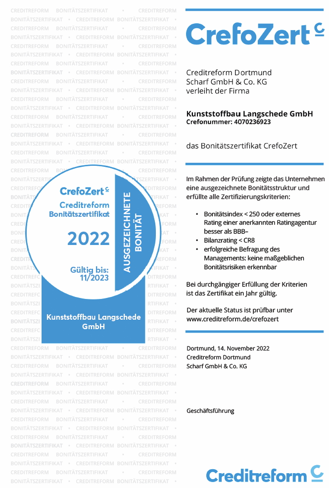 Am 08. November 2022 wurde die Kunststoffbau Langschede GmbH von der Creditreform1 Dortmund Scharf GmbH & Co. KG zum dritten Mal mit dem Bonitätszertifikat CrefoZert ausgezeichnet. Creditreform1 Dortmund Scharf GmbH bescheinigt der Kunststoffbau Langschede GmbH, dass sie sich in den letzten Jahren ausgezeichnet entwickelt hat und ihre hervorragende Bonität weiterhin halten konnte. Beste Voraussetzungen für das Jahr 2023.