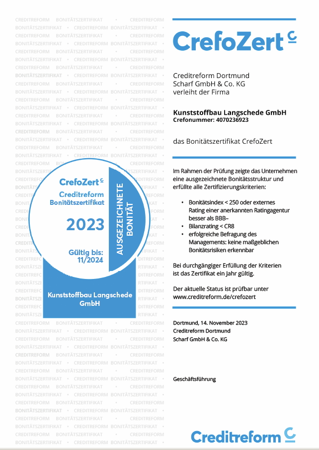 Am 14. November 2023 wurde die Kunststoffbau Langschede GmbH von der Creditreform1 Dortmund Scharf GmbH & Co. KG zum vierten Mal nacheinander mit dem Bonitätszertifikat CrefoZert ausgezeichnet. Creditreform1 Dortmund Scharf GmbH bescheinigt der Kunststoffbau Langschede GmbH, dass sie sich in den letzten Jahren ausgezeichnet entwickelt hat und ihre hervorragende Bonität weiterhin halten konnte. Beste Voraussetzungen für das Jahr 2024.